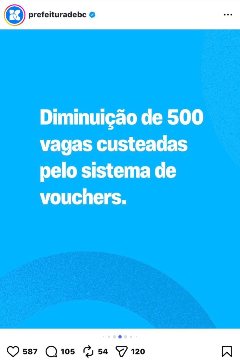 Outro ponto que gera preocupação é a comunicação do Poder Executivo Municipal, divulgada em 30 de dezembro de 2025, afirmando que a redução de aproximadamente 500 vagas ofertadas por meio do sistema de vouchers seria algo benéfico para os munícipes.
